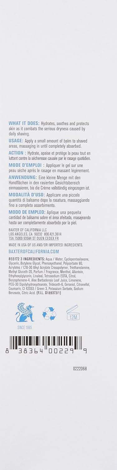 The Baxter Of California After Shave Balm is designed to lock in moisture, maintaining the skin's natural balance and promoting a healthy complexion. It absorbs quickly and leaves no greasy residue, making it suitable for all skin types. With its refreshing scent and lightweight texture, it provides a pleasant and rejuvenating after-shave experience.