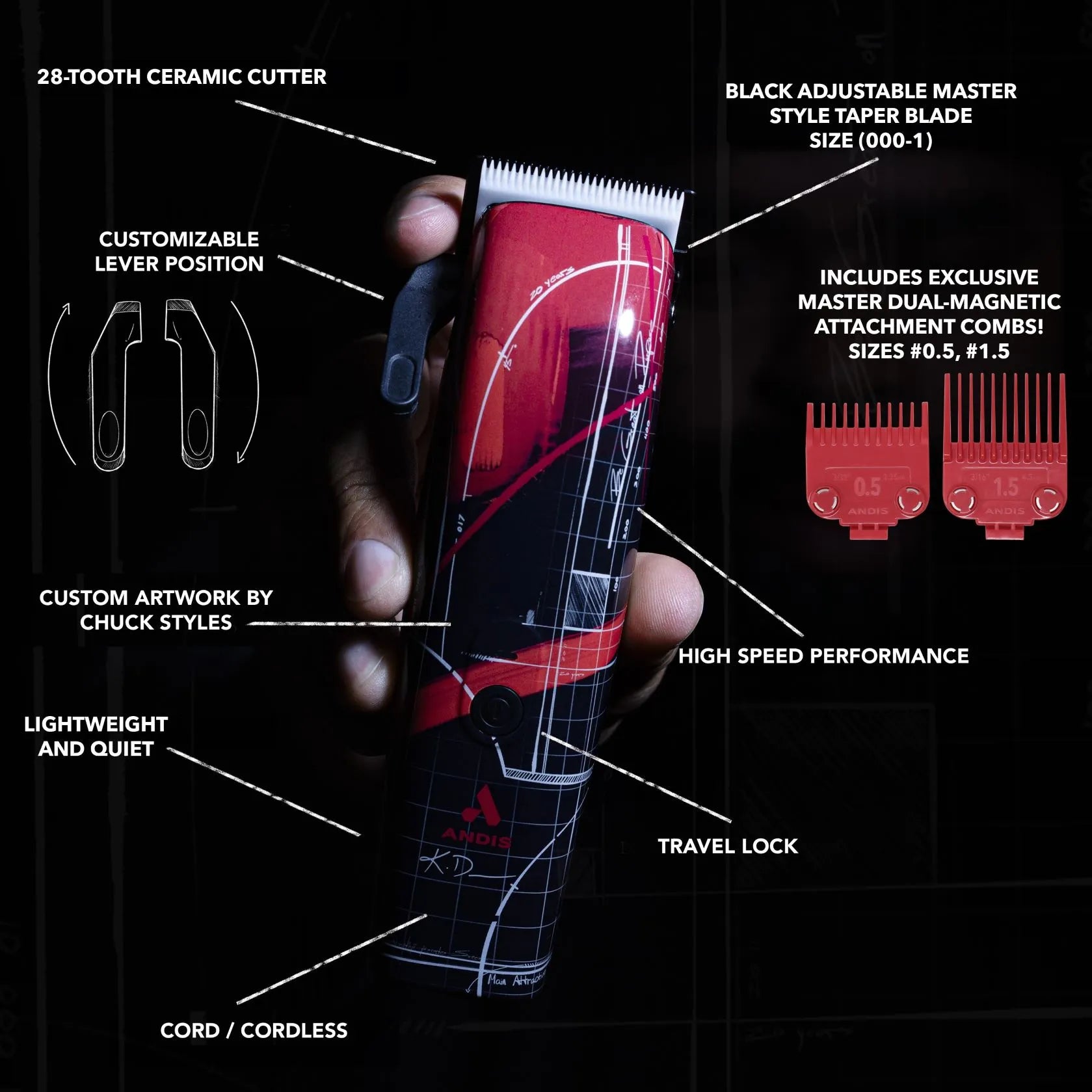 The clipper's design also includes a vibrant, custom finish, showcasing a sleek and modern aesthetic that stands out in any barbershop or salon. The stylish appearance of the Kenny Duncan Edition reflects the unique partnership between Andis and one of the industry's most influential barbers, Kenny Duncan. It’s not just a tool; it’s a piece of art that embodies the spirit of innovation and creativity in the world of grooming.