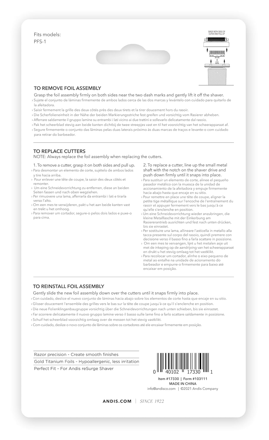 The replacement cutters and foil are engineered with the same precision and quality that Andis is known for. These components are designed to work seamlessly with the Andis reSURGE Shaver, ensuring that every stroke offers smooth and clean results. The high-quality gold titanium-coated foil and cutters provide a close shave, while reducing skin irritation and minimizing the risk of razor bumps.