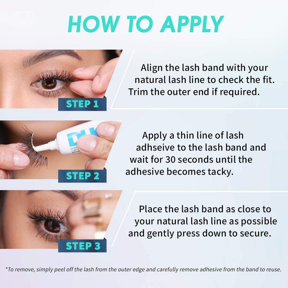 Before applying, ensure your eyelid is clean and free of makeup. Take the Ardell Natlash 118 Black and apply a thin line of lash adhesive to the lash band. Wait for 30 seconds for it to get tacky. Then, apply the lash just above your natural lash line, starting from the inner corner of the eye. Push the lashes down to set them in place.