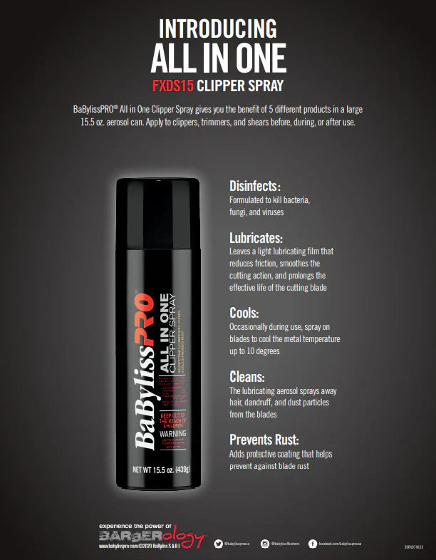 This all-in-one spray combines cooling, disinfecting, lubricating, cleaning, and rust prevention in a single powerful product. Instead of juggling multiple maintenance sprays, the BaBylissPRO All in One does it all—making it an indispensable part of your grooming routine. Whether you're in between clients or deep-cleaning your tools at the end of the day, this spray is your ultimate blade care companion.
