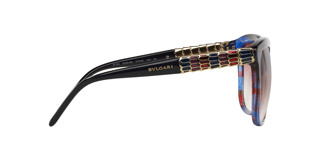 Bvlgari BV8155 5339-8H is a full rim frame for women which is made of acetate material. Features of sunglasses are blue red fantasy color frame with violet gradient lens in square shape. The logo of Bvlgari is displayed on the temple.