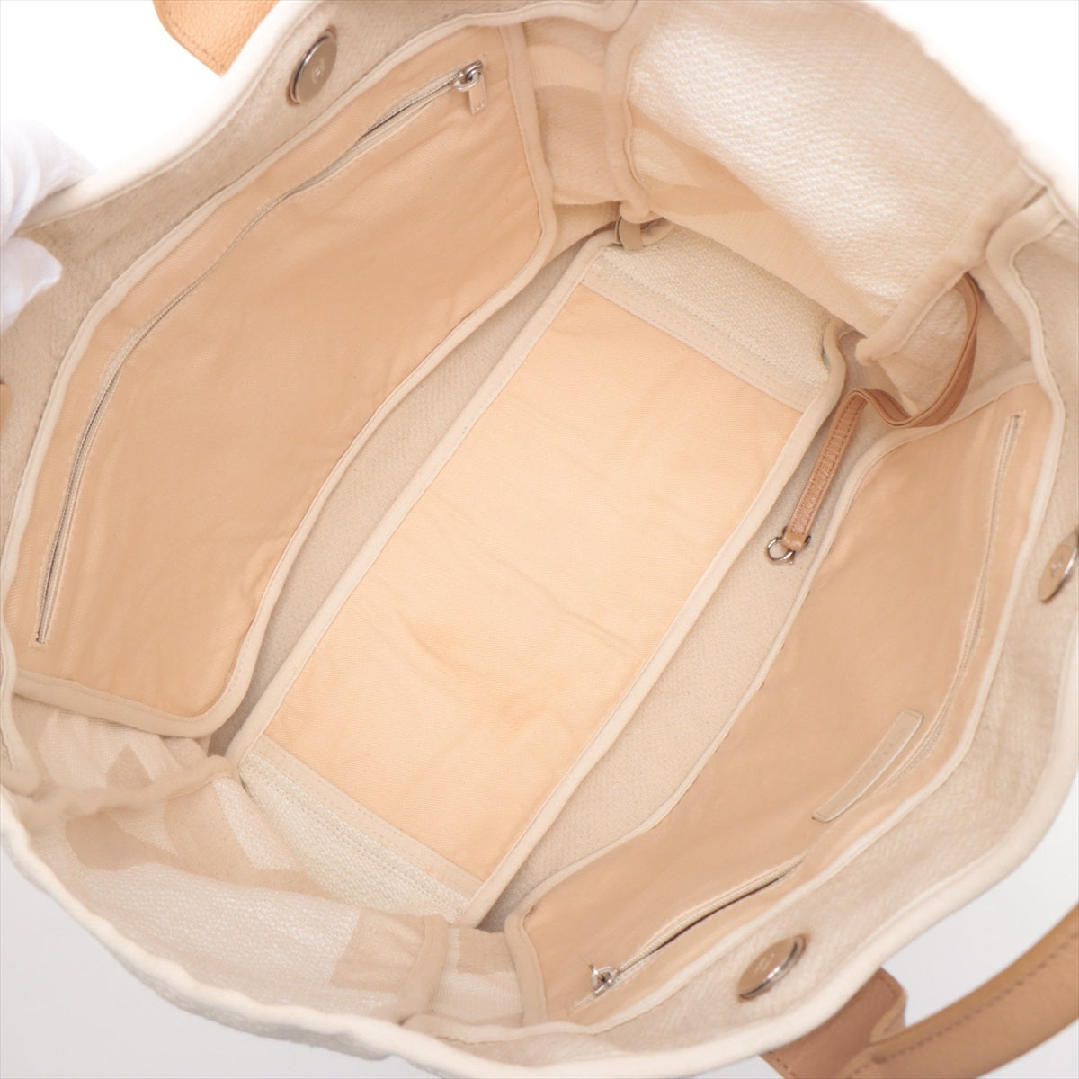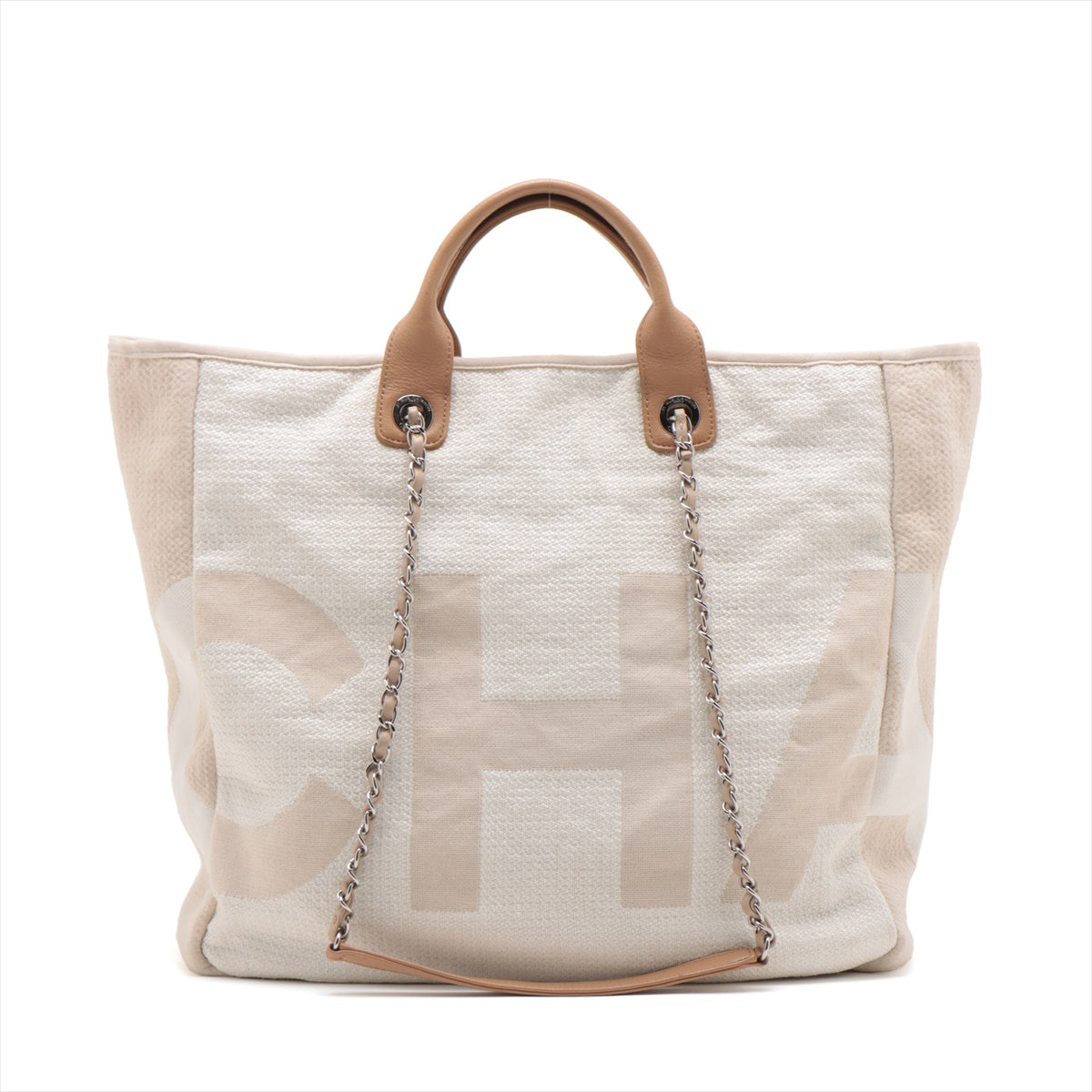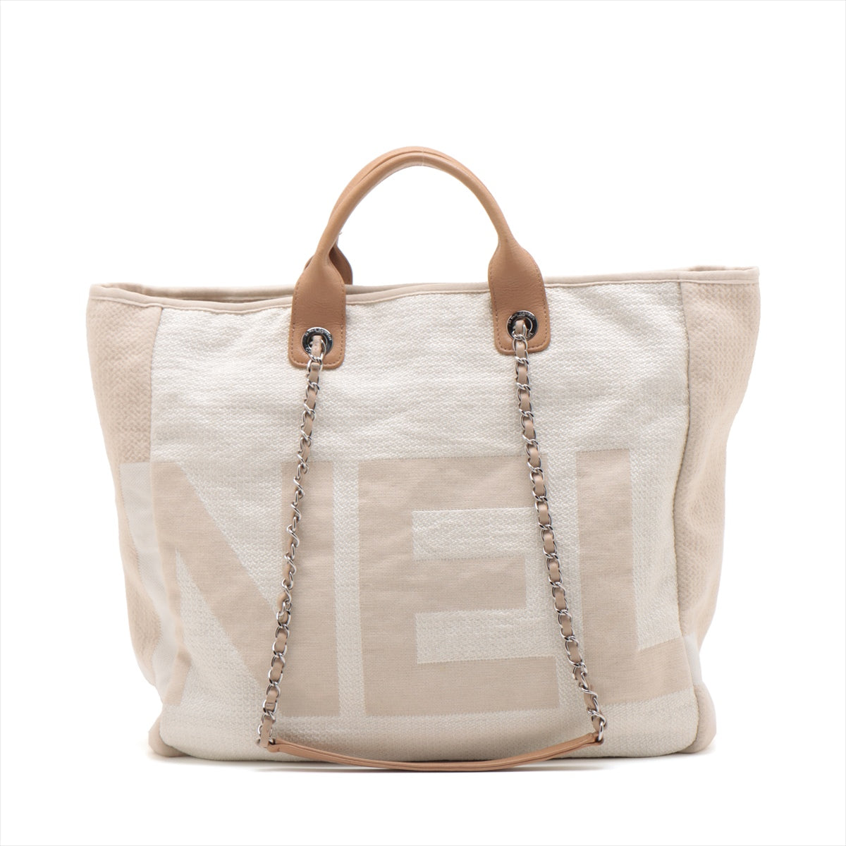 The Chanel Canvas Deauville Tote Bag in Light Beige is a chic and versatile accessory that effortlessly blends casual elegance with the iconic Chanel aesthetic. Crafted from durable canvas, the tote features oversized Chanel lettering all over the exterior, making a strong style statement. The light beige color adds an elegant touch to the bag's versatility. What sets the bag apart is the inclusion of both a chain strap and a leather strap, providing multiple carrying options. The spacious interior is lined with fabric and includes practical pockets for organization, catering to everyday needs. And the silver-tone hardware adds a luxurious finish.