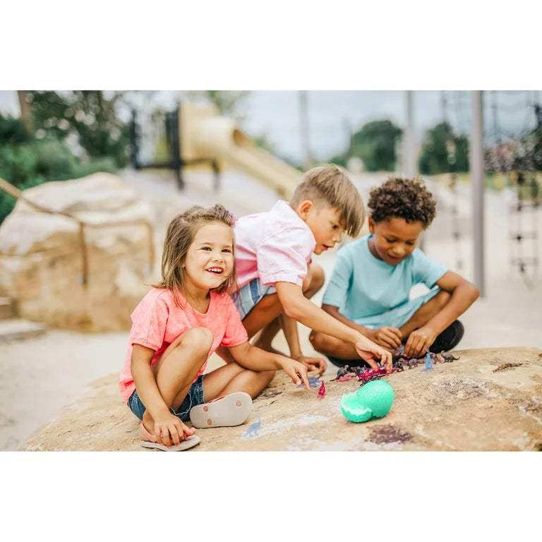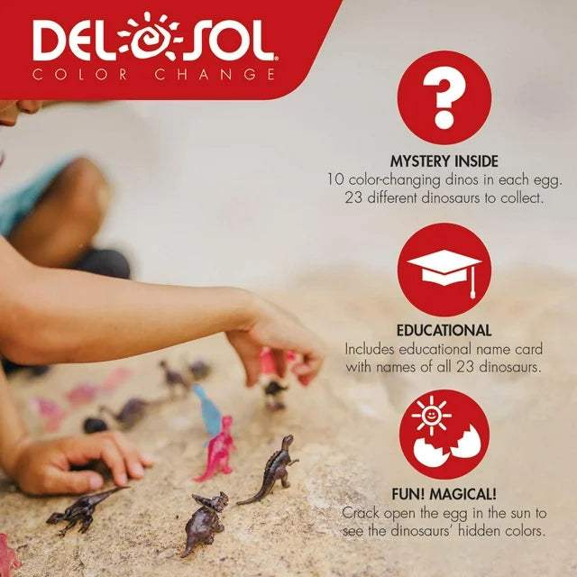 Crack open the mystery of these Del Sol-exclusive dinosaurs every time you let them loose outside in the sun to reveal their dino-mite color change! Discover what color-changing dinosaur mysteries lurk inside each colorful dino egg.