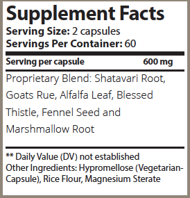 Organic Ingredients: Shatavari Root, Goats Rue, Marshmallow Root, Blessed Thistle, Alfalfa Leaf and Fennel Seed