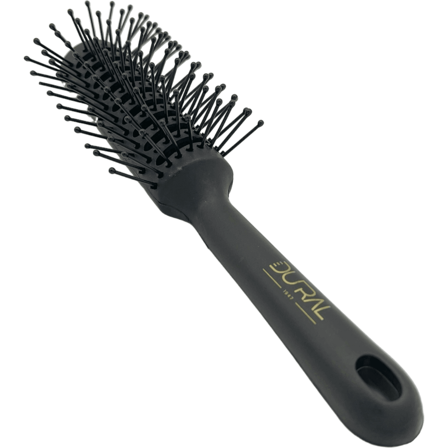 The Dural Tunnel Brush is a hairbrush designed for use on wet or dry hair. It features a plastic body and heat-resistant nylon bristles with ball tips, which are gentle on the scalp and prevent hair breakage. The bristles are arranged in a tunnel shape, which allows airflow for more effective detangling and styling of the hair.