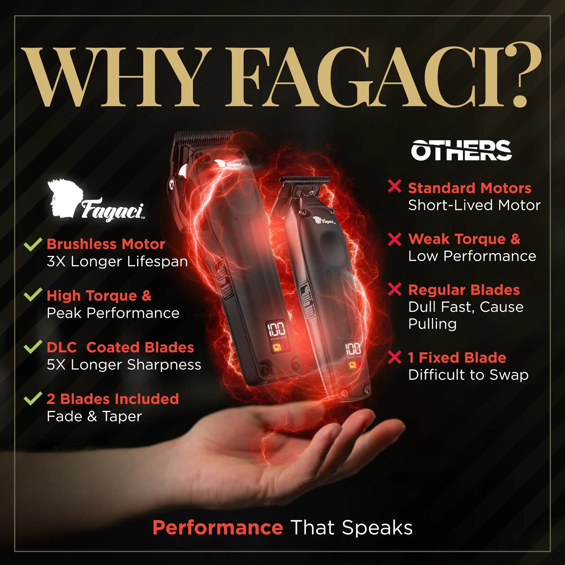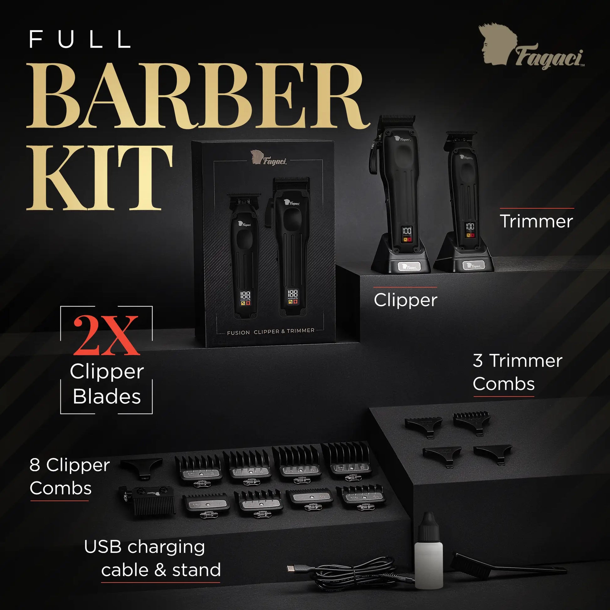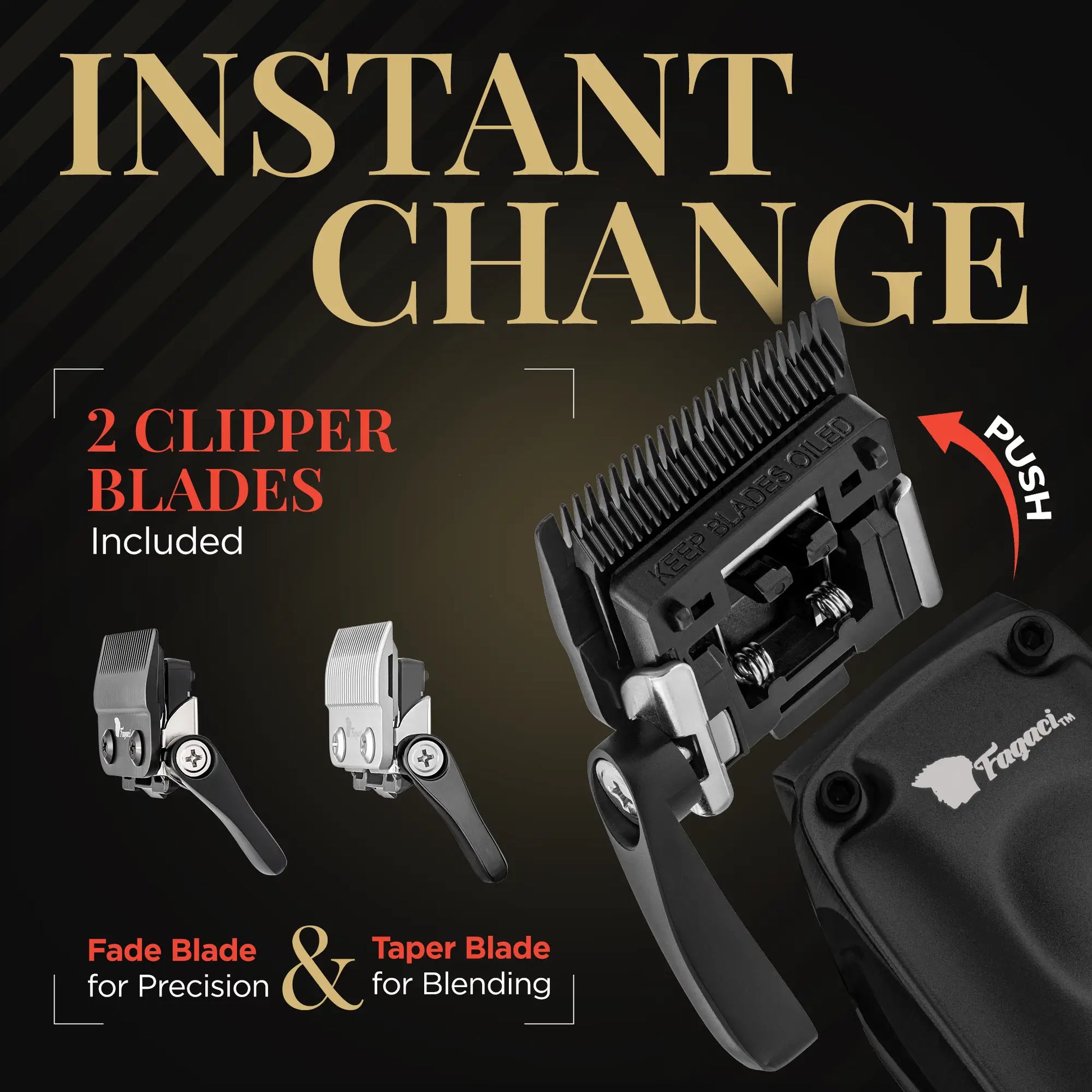 2 BLADES, FADE + TAPER - Fagaci Fusion Clipper & Trimmer set features easily swappable fade and taper blades. Simply press to remove, click to attach - effortless precision!