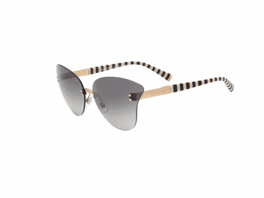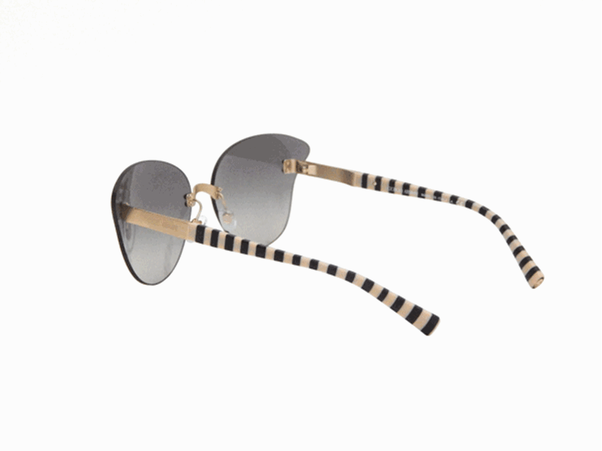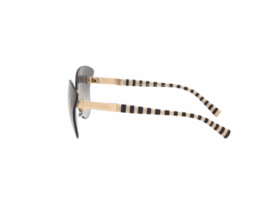 Giorgio Armani AR 6028, gold metal sunglasses with beige striped black auctions with the logo engraved on metal hinge. Shaded gray lenses have been fitted into a metal frame.