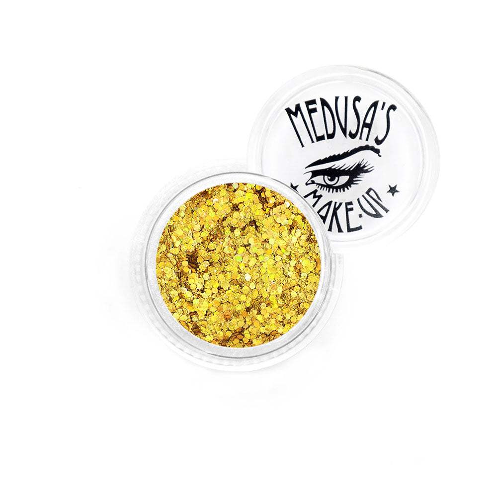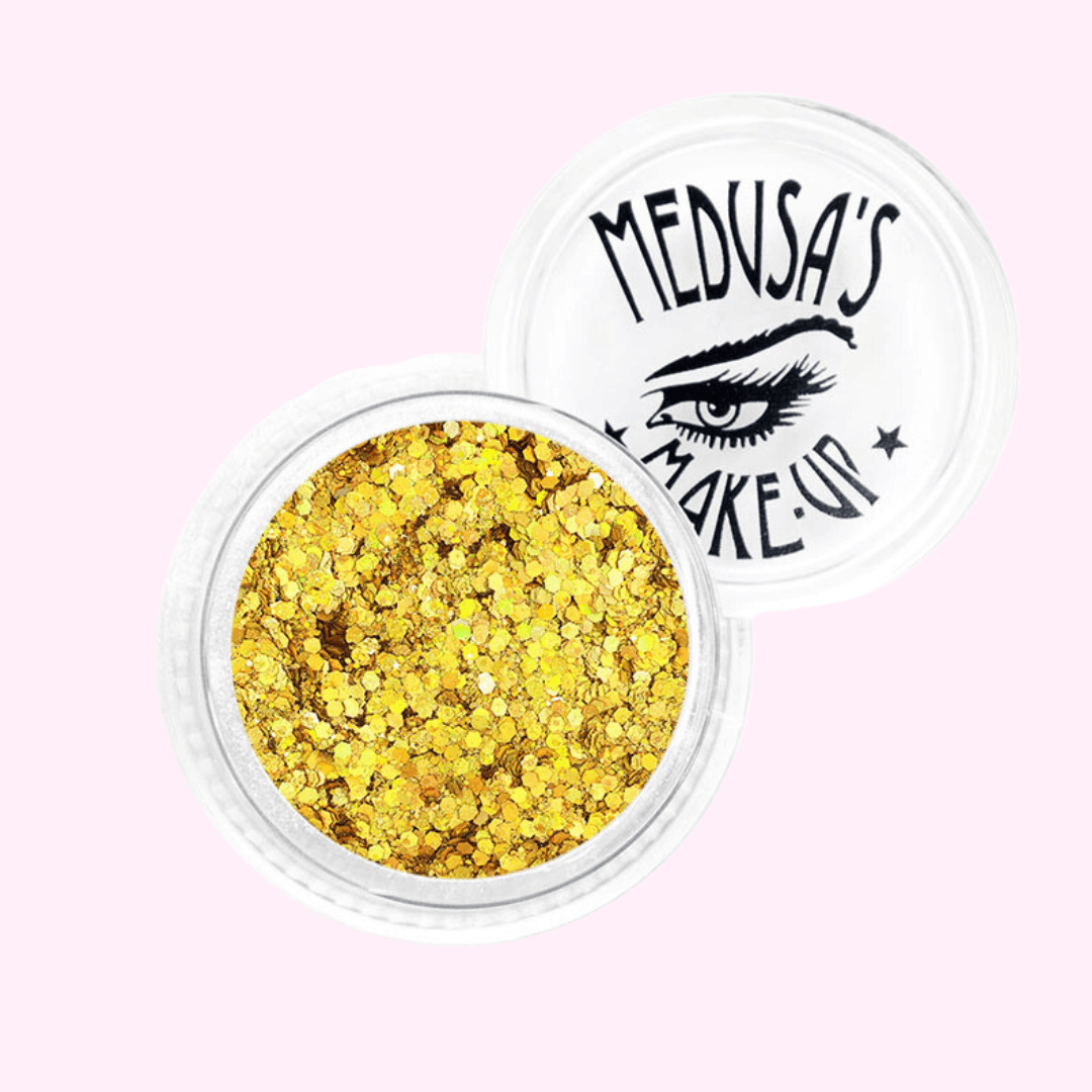 Medusa's Make-Up Glittergasm glitter powders are truly like galaxy dust! This cosmetic grade mix of micro sparkle and chunky sized glitter particles can be great for party makeup, festival makeup and cheerleader makeup and roller derby. Can be applied to eyes, lips and face.
