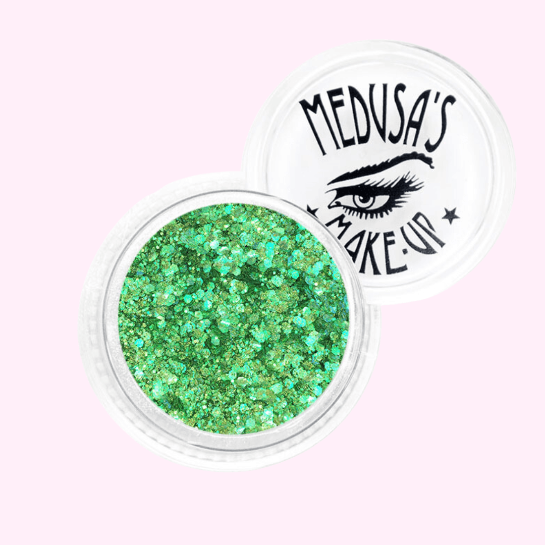 Medusa's Make-Up Glittergasm glitter powders are truly like galaxy dust! This cosmetic grade mix of micro sparkle and chunky sized glitter particles can be great for party makeup, festival makeup and cheerleader makeup and roller derby. Can be applied to eyes, lips and face.