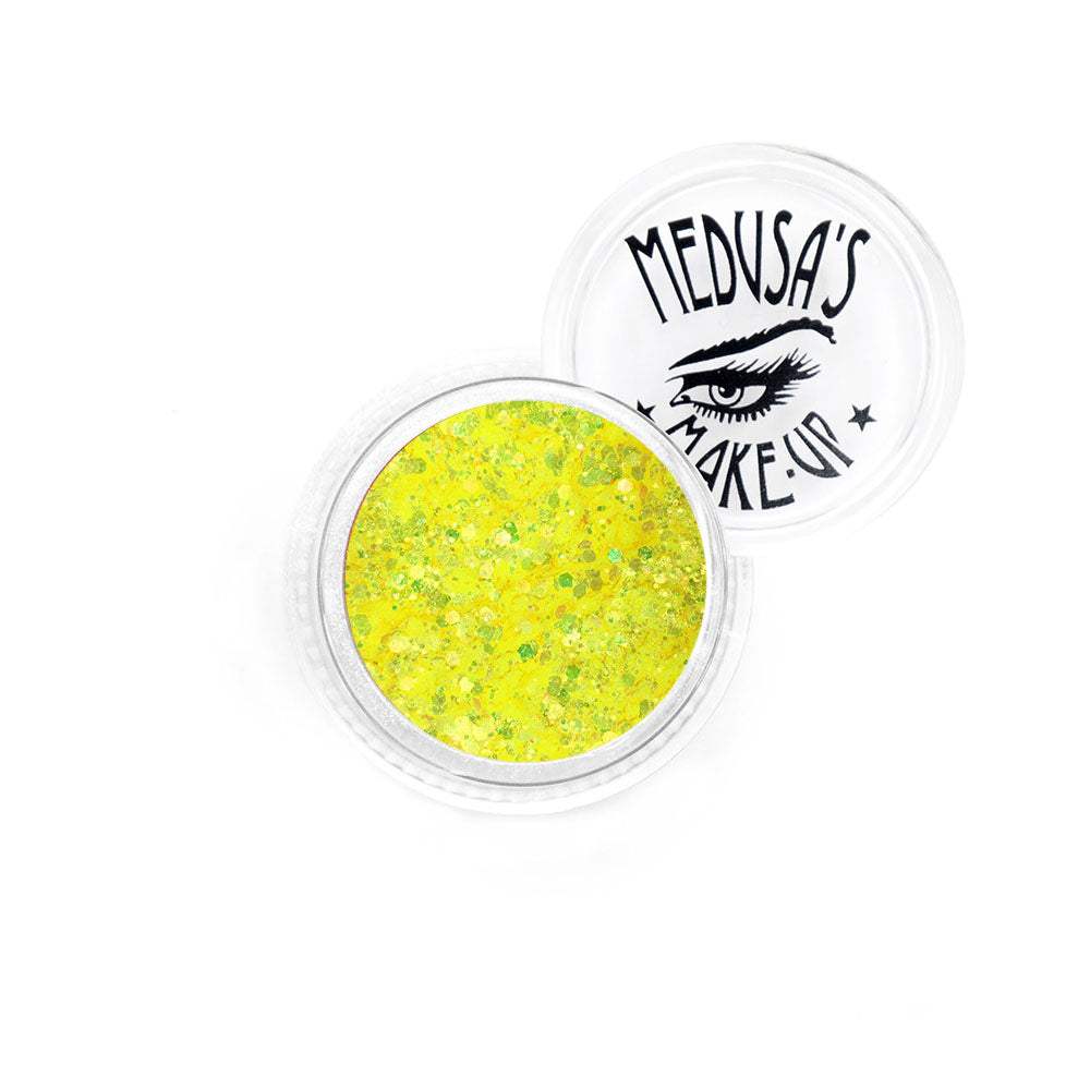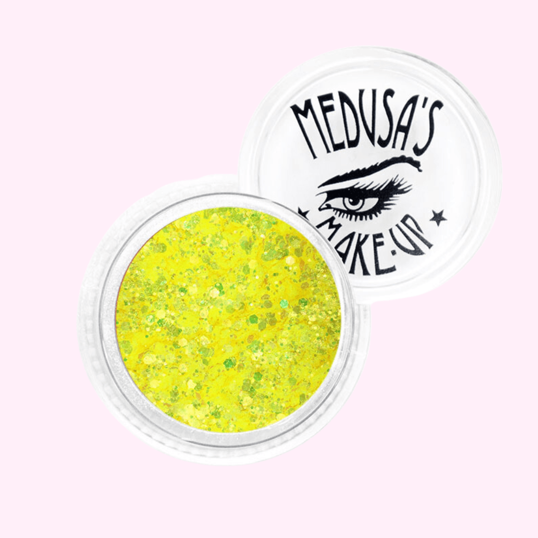 Medusa's Make-Up Glittergasm glitter powders are truly like galaxy dust! This cosmetic grade mix of micro sparkle and chunky sized glitter particles can be great for party makeup, festival makeup and cheerleader makeup and roller derby. Can be applied to eyes, lips and face.