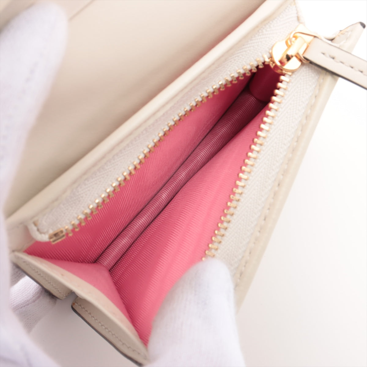 The Gucci GG Canvas Apple Heart Compact Wallet in Beige and White beautifully marries sophistication with whimsy. Its exterior, crafted from the iconic GG canvas in beige and ebony, presents a classic and recognizable design. Adding a delightful twist, an apple heart motif adorns the canvas, infusing the wallet with playful charm. Opening the wallet reveals a luxurious inner lining made of smooth white leather, providing both durability and elegance to its interior. With ample space for cards, coins, and bills, the compact accessory effortlessly combines style and functionality, making it a perfect choice for everyday use.