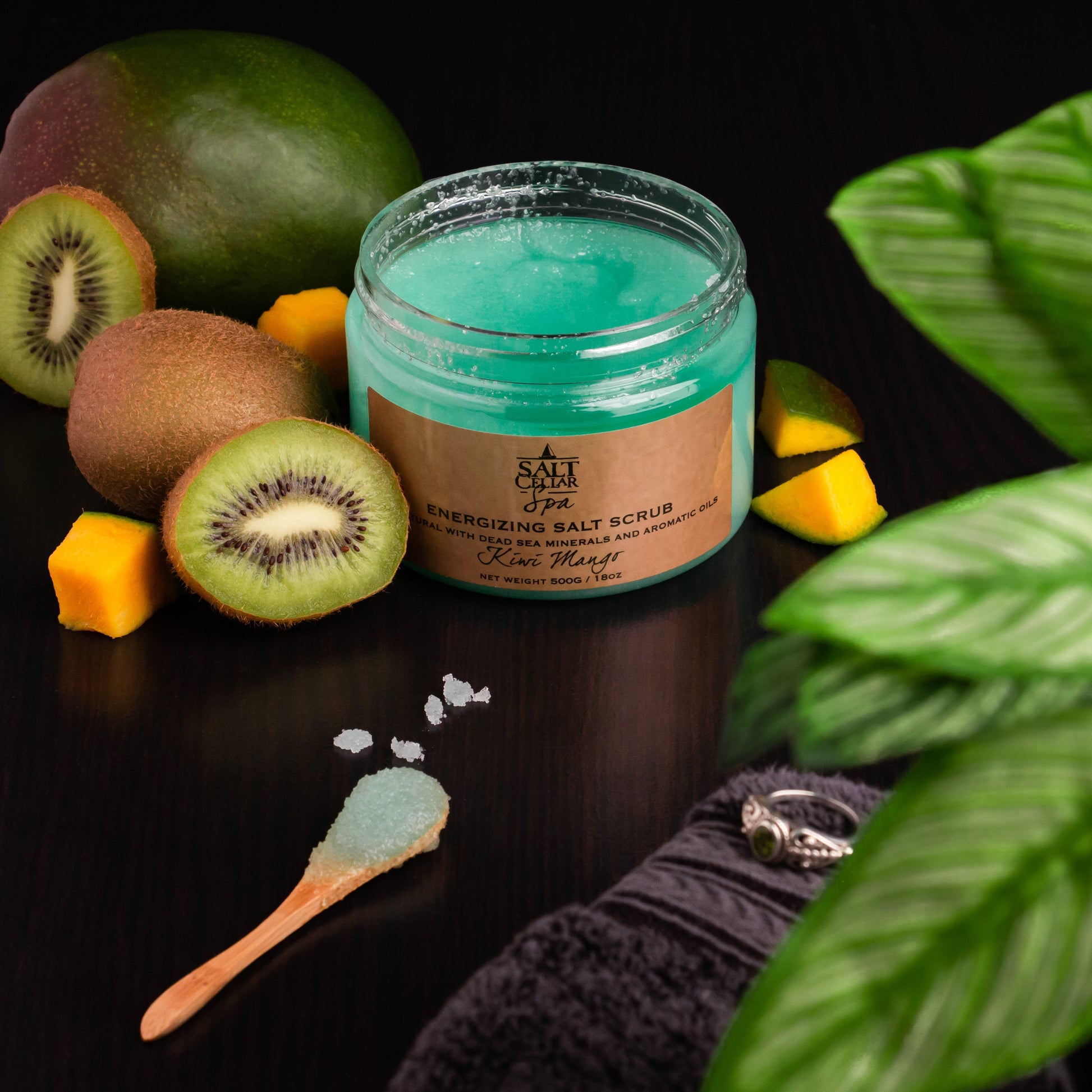 Our Energizing Kiwi Mango Salt Scrub combines Dead Sea minerals with natural aromatic oil that is known for its energetic effects. Gentle and reviving, the scrub exfoliates the top layer of dead skin cells, encourages circulation, and rejuvenates the skin. The refreshing and mildly sweet aroma will leave your skin soft, refreshed, and fragrant.