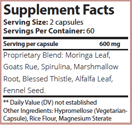 Organic Ingredients: Moringa Leaf, Goats Rue, Spirulina, Marshmallow Root, Blessed Thistle, Alfalfa Leaf and Fennel Seed