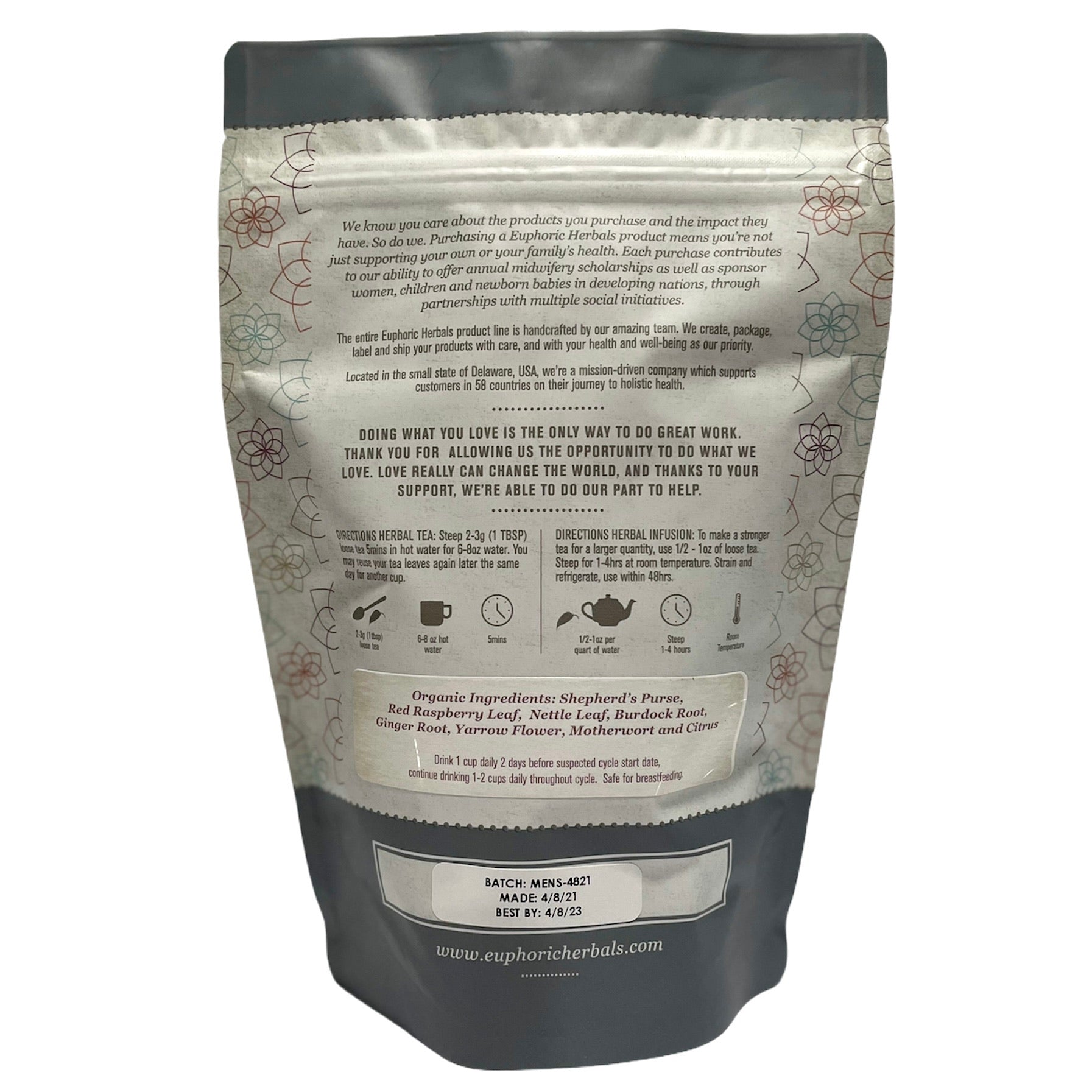 Organic Ingredients: Shephereds Purse Leaf, Motherwort Leaf, Yarrow Flower, Nettle Leaf, Burdock Root, Red Raspberry Leaf, Ashwagandha Root, Peppermint Leaf, Citrus Peel, and Stevia Leaf