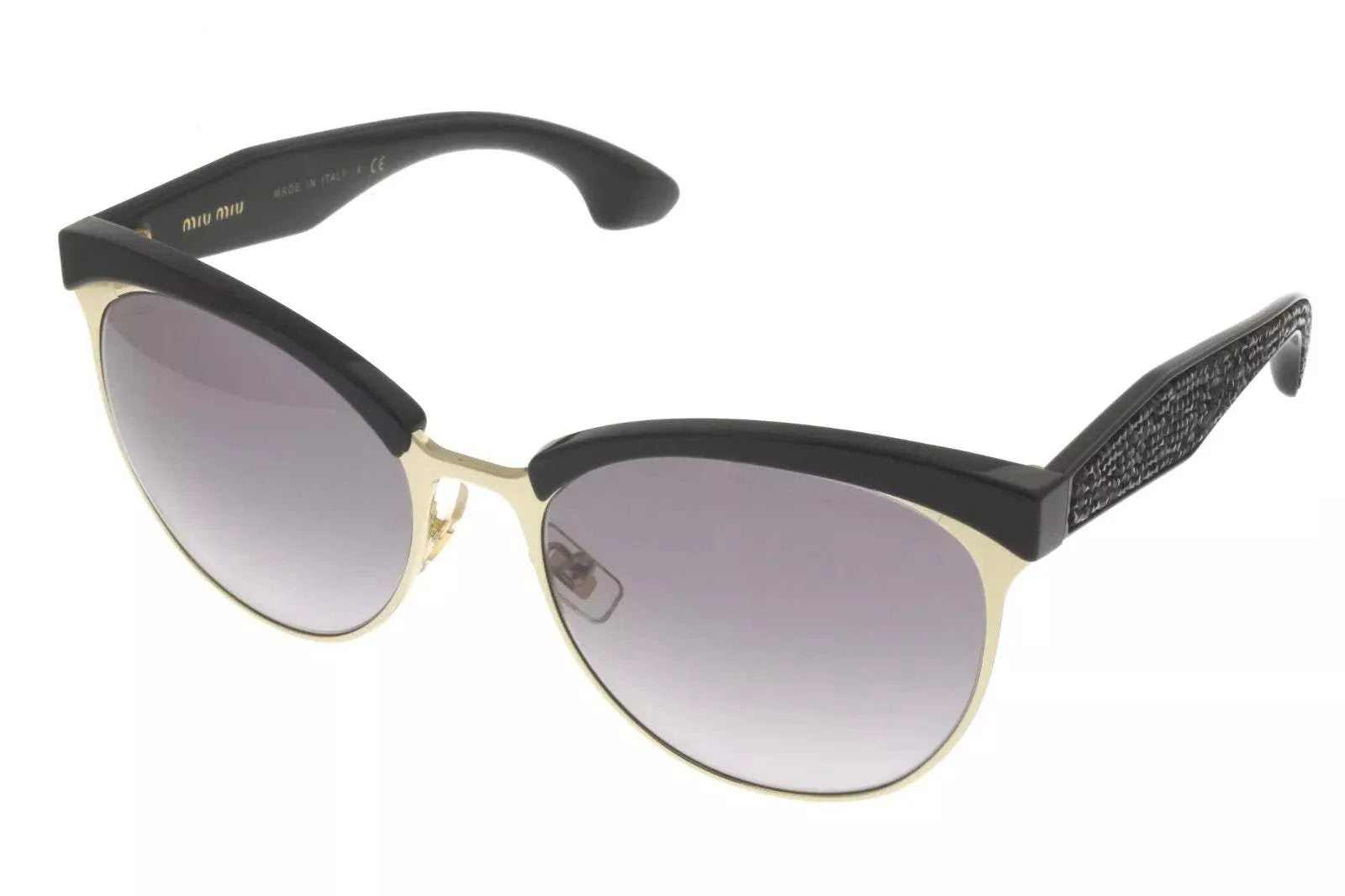 Miu miu mu 54q 1ab-3e2 has a black pale gold crystals metal plastic frame material designed for women. It has a cat eye shape and has gradient lens technology which uva & uvb protection.