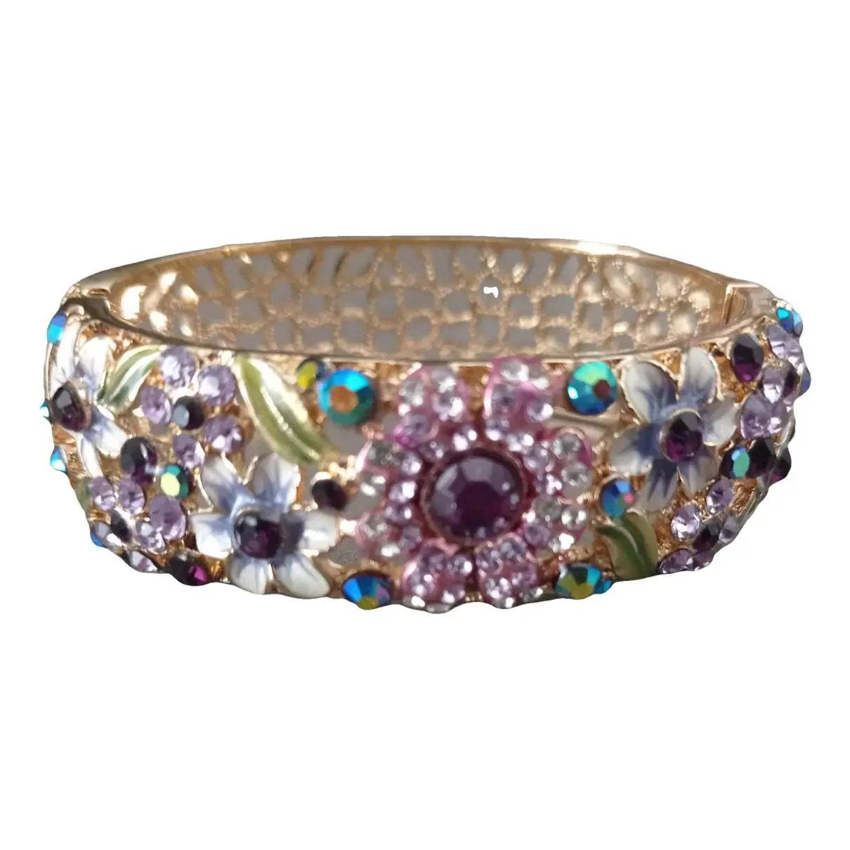 Launched by the design house of Manoush. This golden wrist cuff features molten metalwork punctuated with a glowing mix of sparkling jewels and stones.