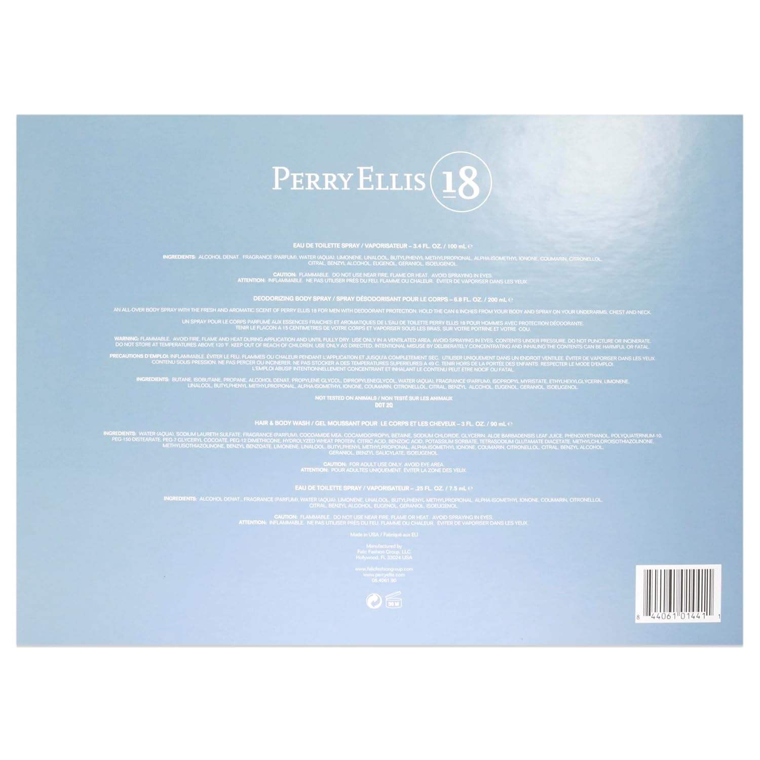 Perry Ellis 18 by Perry Ellis for Men - 4 Pc Gift Set 3.4oz EDT Spray, 0.25oz EDT Spray, 6oz Body Spray, 3oz Hair and Body Wash