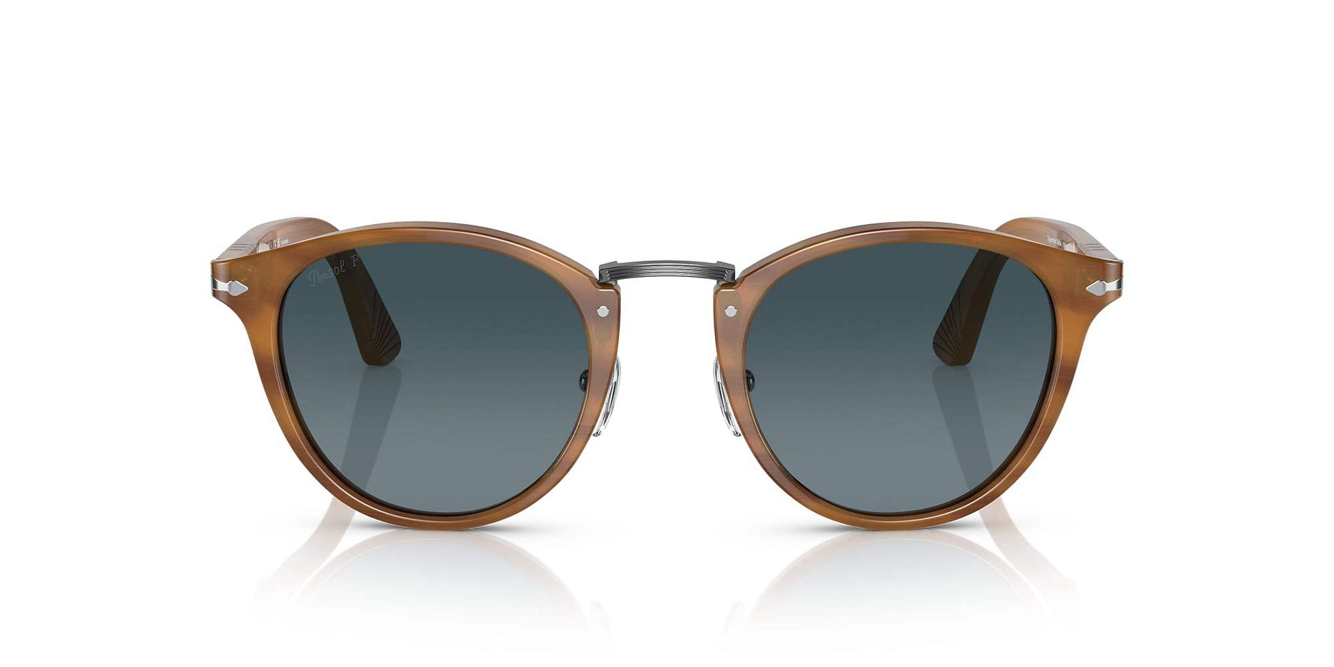 Persol PO3108S 1019-M3 is a full rim frame for men which is made of plastic material. Features of sunglasses are striped beige color frame with grey polarized gradient lens in a round shape. The logo of Persol is displayed on the temple.
