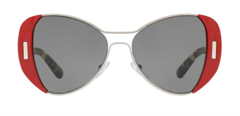 Prada SPR 60S SMN-9K1 is a full rim frame for women which is made of plastic material. Features of sunglasses are silver red color frame with dark grey lens and 55-16-135 mm size.
