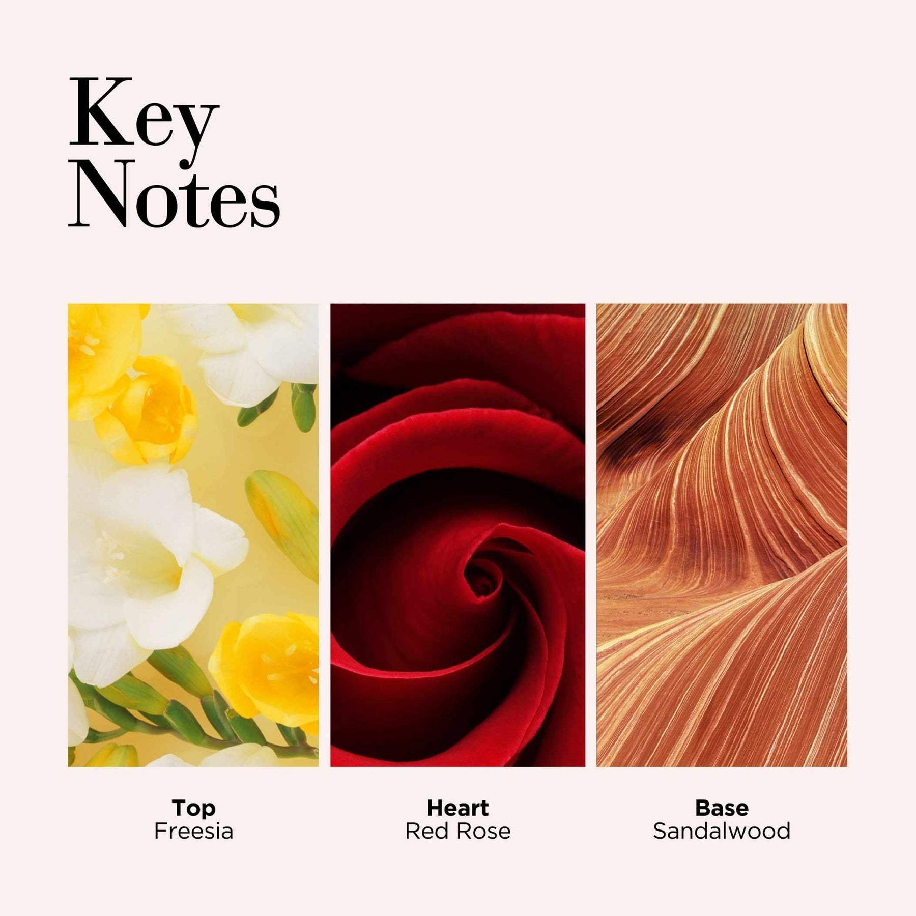 The scent opens with the enchanting aroma of red rose, adding a touch of romance and allure to your day. The vibrant notes of violet and jasmine create a harmonious blend that evokes feelings of grace and beauty.